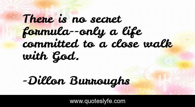 This page presents the quote "There is no secret formula--only a life committed to a close walk with God.". Author of this quote is Dillon Burroughs. This quote is about god-s-will, secret, living-for-god,.