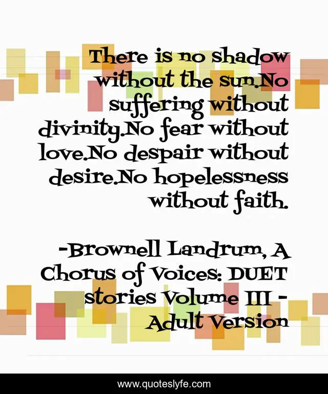 This page presents the quote "There is no shadow without the sun.No suffering without divinity.No fear without love.No despair without desire.No hopelessness without faith.". Author of this quote is Brownell Landrum, A Chorus of Voices: DUET stories Volume III - Adult Version. This quote is about desire, faith, divinity, sun, duet-stories, suffering, despair, hopeless, brownell-landrum,.