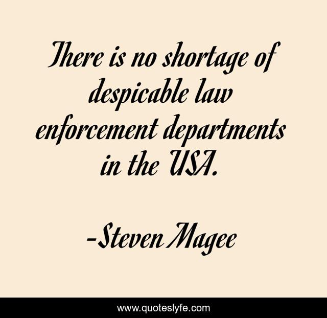 This page presents the quote "There is no shortage of despicable law enforcement departments in the USA.". Author of this quote is Steven Magee. This quote is about enforcement, police-reform, police, usa, sheriff, policeman, police-state, policemen, departments,.