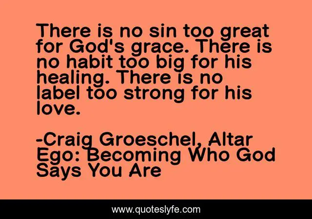 This page presents the quote "There is no sin too great for God's grace. There is no habit too big for his healing. There is no label too strong for his love.". Author of this quote is Craig Groeschel, Altar Ego: Becoming Who God Says You Are. This quote is about god, gods-love, inspirational, enthusiasm,.