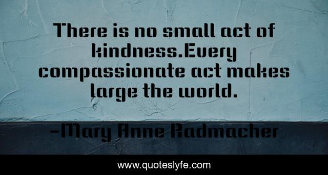 This page presents the quote "There is no small act of kindness.Every compassionate act makes large the world.". Author of this quote is Mary Anne Radmacher. This quote is about compassion, kindness, empathy,.