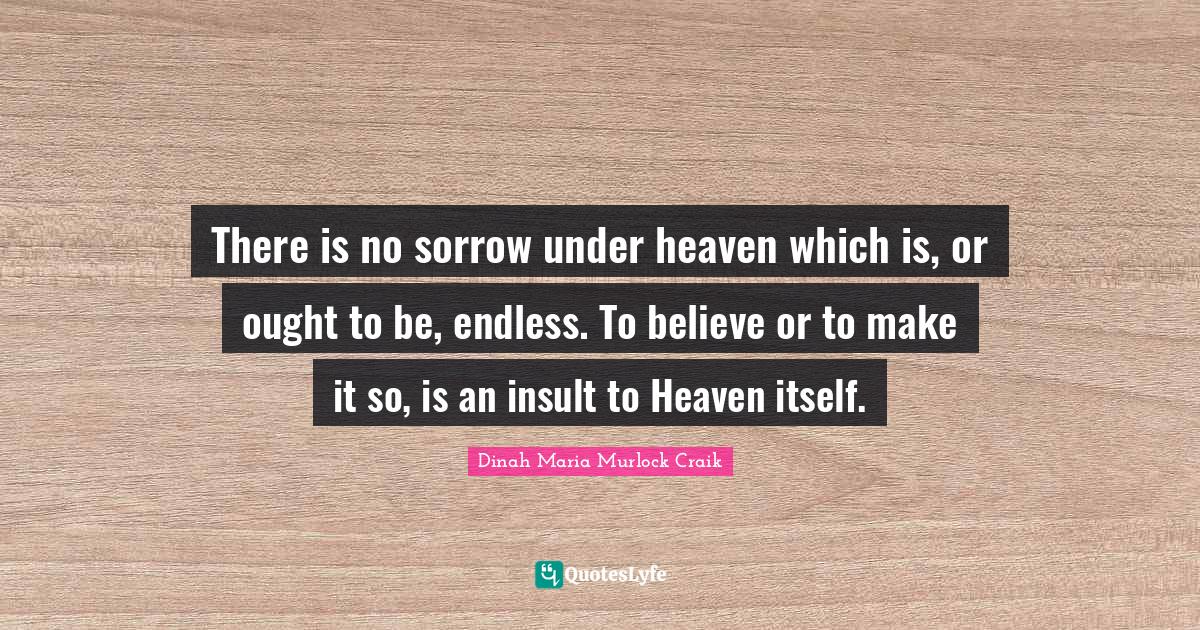 This page presents the quote "There is no sorrow under heaven which is, or ought to be, endless. To believe or to make it so, is an insult to Heaven itself.". Author of this quote is Dinah Maria Murlock Craik. This quote is about sorrow, endless, insult, heaven, believe, ought,.