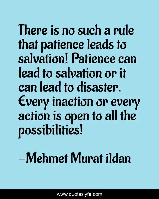 This page presents the quote "There is no such a rule that patience leads to salvation! Patience can lead to salvation or it can lead to disaster. Every inaction or every action is open to all the possibilities!". Author of this quote is Mehmet Murat ildan. .