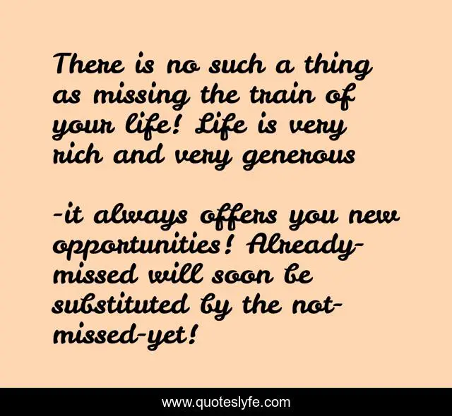 This page presents the quote "There is no such a thing as missing the train of your life! Life is very rich and very generous". Author of this quote is it always offers you new opportunities! Already-missed will soon be substituted by the not-missed-yet!. .
