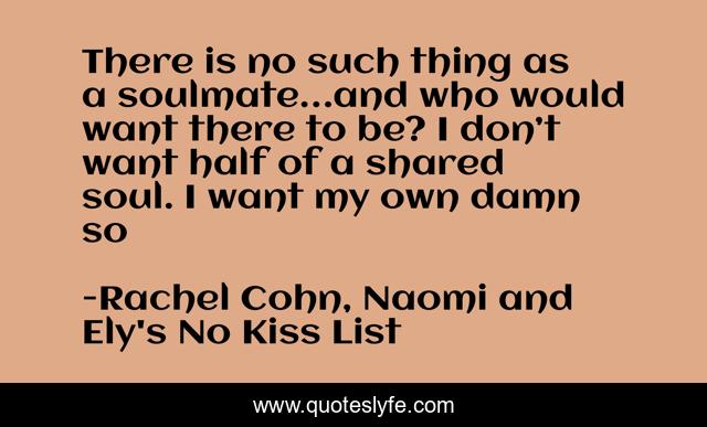 This page presents the quote "There is no such thing as a soulmate…and who would want there to be? I don’t want half of a shared soul. I want my own damn so". Author of this quote is Rachel Cohn, Naomi and Ely's No Kiss List. .