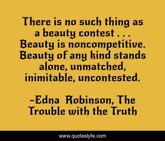 This page presents the quote "There is no such thing as a beauty contest . . . Beauty is noncompetitive. Beauty of any kind stands alone, unmatched, inimitable, uncontested.". Author of this quote is Edna Robinson, The Trouble with the Truth. .