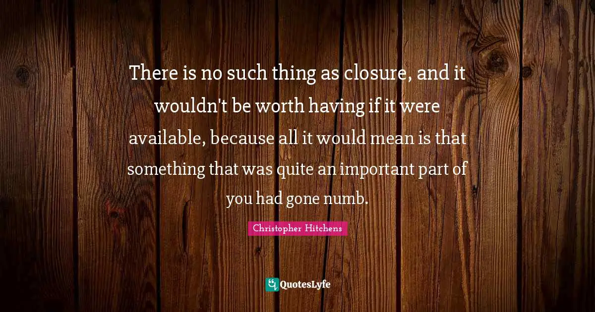 This page presents the quote "There is no such thing as closure, and it wouldn't be worth having if it were available, because all it would mean is that something that was quite an important part of you had gone numb.". Author of this quote is Christopher Hitchens. This quote is about important, gone, closure, numb, mean, available,.