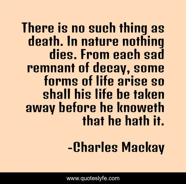 This page presents the quote "There is no such thing as death. In nature nothing dies. From each sad remnant of decay, some forms of life arise so shall his life be taken away before he knoweth that he hath it.". Author of this quote is Charles Mackay. This quote is about life, death, sad,.
