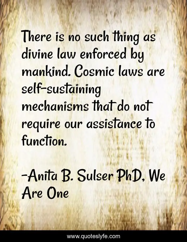 This page presents the quote "There is no such thing as divine law enforced by mankind. Cosmic laws are self-sustaining mechanisms that do not require our assistance to function.". Author of this quote is Anita B. Sulser PhD, We Are One. This quote is about consciousness, mankind, truth, cosmic-laws,.