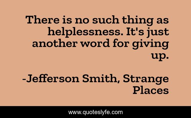 This page presents the quote "There is no such thing as helplessness. It's just another word for giving up.". Author of this quote is Jefferson Smith, Strange Places. This quote is about helplessness, fantasy, determination, persistence, surrender, young-adult, hope,.