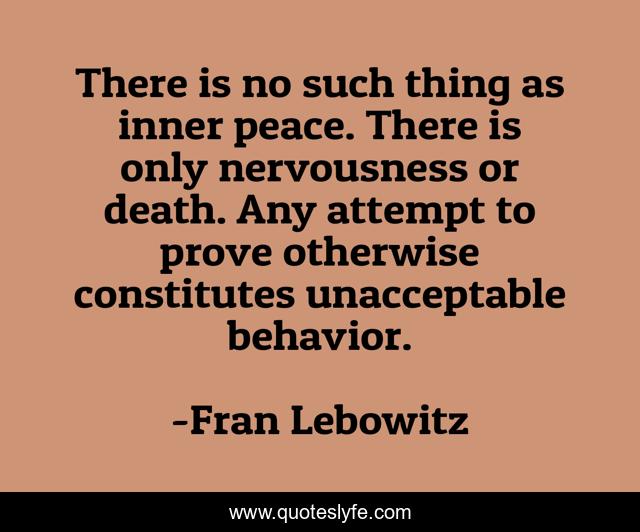 This page presents the quote "There is no such thing as inner peace. There is only nervousness or death. Any attempt to prove otherwise constitutes unacceptable behavior.". Author of this quote is Fran Lebowitz. This quote is about peace, inner peace, behavior,.