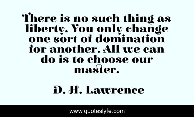 This page presents the quote "There is no such thing as liberty. You only change one sort of domination for another. All we can do is to choose our master.". Author of this quote is D. H. Lawrence. This quote is about master, liberty,.