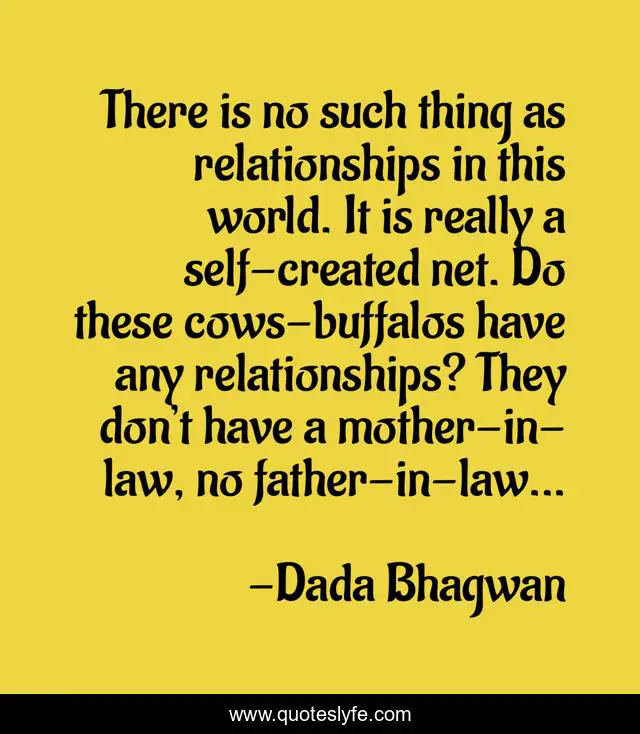 This page presents the quote "There is no such thing as relationships in this world. It is really a self-created net. Do these cows-buffalos have any relationships? They don’t have a mother-in-law, no father-in-law...". Author of this quote is Dada Bhagwan. This quote is about relationships, world, spiritual,.