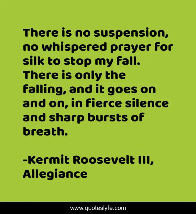This page presents the quote "There is no suspension, no whispered prayer for silk to stop my fall. There is only the falling, and it goes on and on, in fierce silence and sharp bursts of breath.". Author of this quote is Kermit Roosevelt III, Allegiance. This quote is about love, affection,.