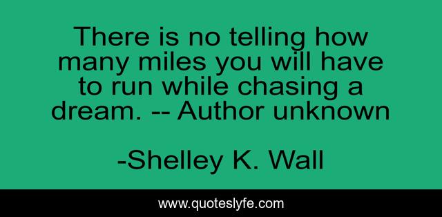 This page presents the quote "There is no telling how many miles you will have to run while chasing a dream. -- Author unknown". Author of this quote is Shelley K. Wall. This quote is about enthusiasm, dream, goals, inspirational,.