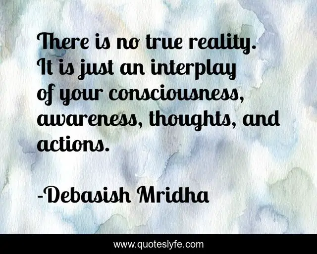 This page presents the quote "There is no true reality. It is just an interplay of your consciousness, awareness, thoughts, and actions.". Author of this quote is Debasish Mridha. This quote is about consciousness, philosophy, debasish-mridha, actions, reality, quotes, awareness, inspirational, enthusiasm,.