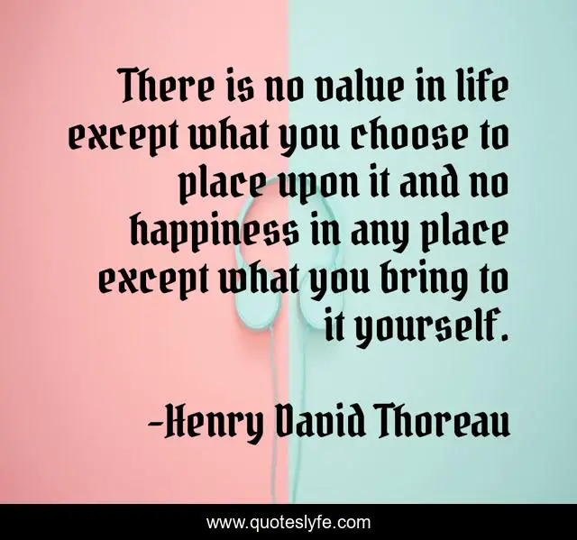 This page presents the quote "There is no value in life except what you choose to place upon it and no happiness in any place except what you bring to it yourself.". Author of this quote is Henry David Thoreau. This quote is about life, value, yourself,.