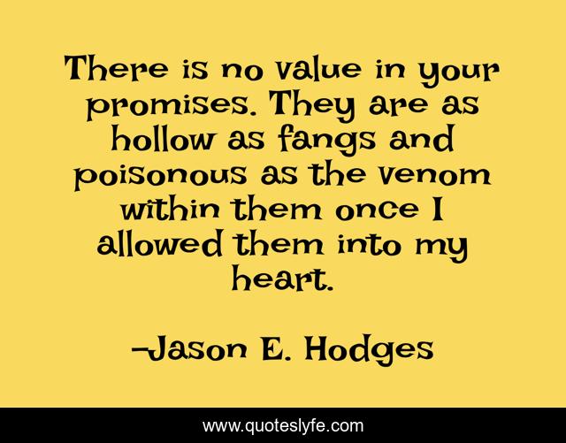 This page presents the quote "There is no value in your promises. They are as hollow as fangs and poisonous as the venom within them once I allowed them into my heart.". Author of this quote is Jason E. Hodges. This quote is about quotes, promises, writers-on-writing, writing,.