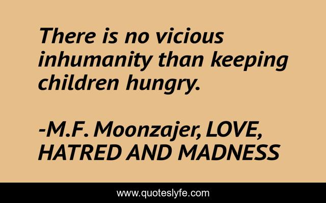 This page presents the quote "There is no vicious inhumanity than keeping children hungry.". Author of this quote is M.F. Moonzajer, LOVE, HATRED AND MADNESS. This quote is about inhumanity, hungry, vicious, children,.