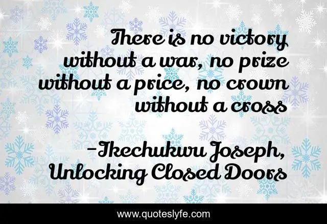 This page presents the quote "There is no victory without a war, no prize without a price, no crown without a cross". Author of this quote is Ikechukwu Joseph, Unlocking Closed Doors. This quote is about spirtual-warfare, christian-living,.