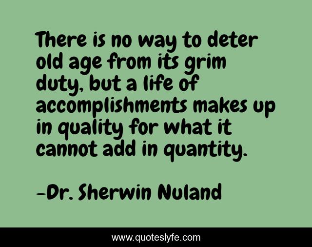 This page presents the quote "There is no way to deter old age from its grim duty, but a life of accomplishments makes up in quality for what it cannot add in quantity.". Author of this quote is Dr. Sherwin Nuland. This quote is about medicine, life, death, accomplishments,.