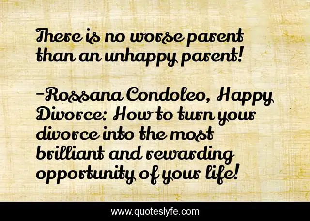This page presents the quote "There is no worse parent than an unhappy parent!". Author of this quote is Rossana Condoleo, Happy Divorce: How to turn your divorce into the most brilliant and rewarding opportunity of your life!. This quote is about children-and-divorce, life-coaching, divorce-frustration, divorce-coaching, guide-to-divorce, parenting-divorce, self-improvement, family-counselling, divorce-relationship,.