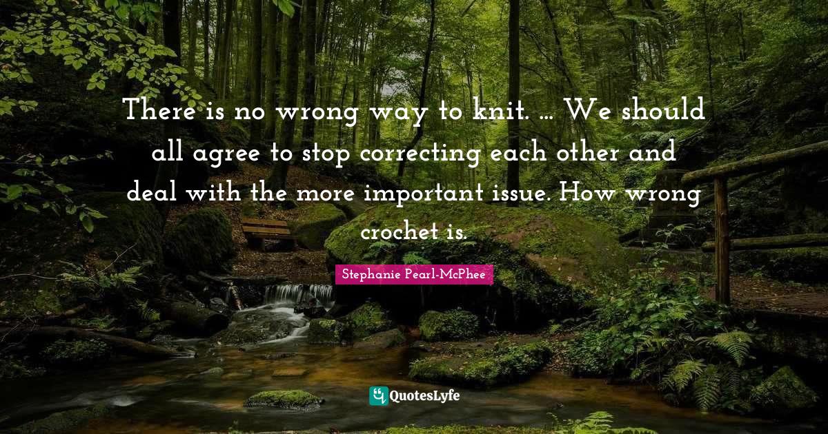 This page presents the quote "There is no wrong way to knit. ... We should all agree to stop correcting each other and deal with the more important issue. How wrong crochet is.". Author of this quote is Stephanie Pearl-McPhee. This quote is about important, correcting, knitting, issues, wrong way, agree,.