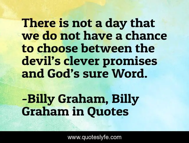 This page presents the quote "There is not a day that we do not have a chance to choose between the devil’s clever promises and God’s sure Word.". Author of this quote is Billy Graham, Billy Graham in Quotes. This quote is about billy-graham, choice,.