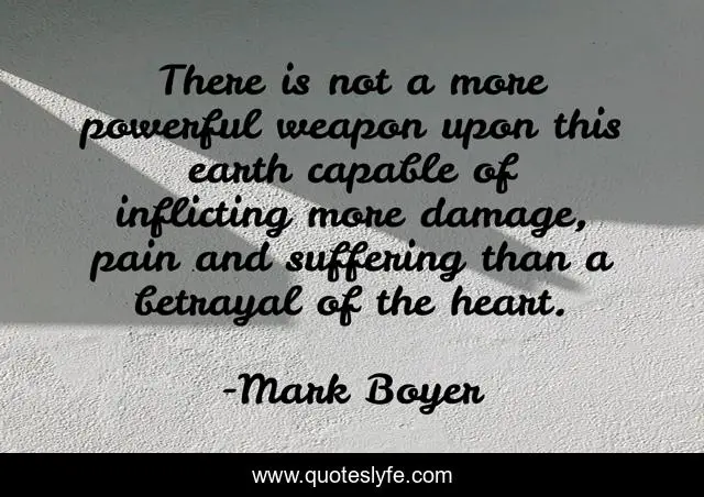 This page presents the quote "There is not a more powerful weapon upon this earth capable of inflicting more damage, pain and suffering than a betrayal of the heart.". Author of this quote is Mark Boyer. This quote is about love, betrayal, romance, scorned, mark-w-boyer, affection,.