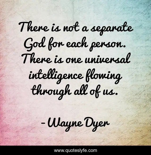 This page presents the quote "There is not a separate God for each person. There is one universal intelligence flowing through all of us.". Author of this quote is Wayne Dyer. This quote is about god, through, person,.