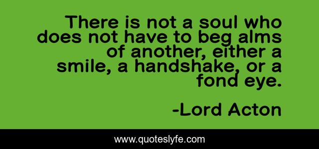 This page presents the quote "There is not a soul who does not have to beg alms of another, either a smile, a handshake, or a fond eye.". Author of this quote is Lord Acton. This quote is about handshake, eye, soul,.