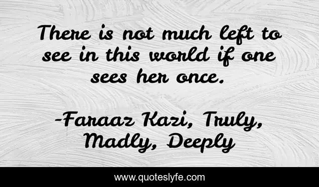 This page presents the quote "There is not much left to see in this world if one sees her once.". Author of this quote is Faraaz Kazi, Truly, Madly, Deeply. This quote is about love, love-at-first-sight, affection, insanity,.