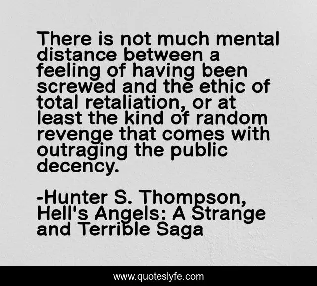 This page presents the quote "There is not much mental distance between a feeling of having been screwed and the ethic of total retaliation, or at least the kind of random revenge that comes with outraging the public decency.". Author of this quote is Hunter S. Thompson, Hell's Angels: A Strange and Terrible Saga. This quote is about philosophy, chaos,.