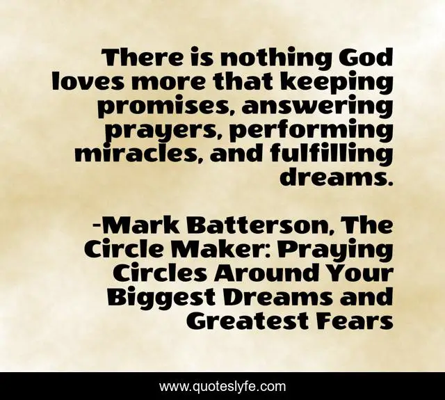 This page presents the quote "There is nothing God loves more that keeping promises, answering prayers, performing miracles, and fulfilling dreams.". Author of this quote is Mark Batterson, The Circle Maker: Praying Circles Around Your Biggest Dreams and Greatest Fears. This quote is about miracles, promises, dreams, prayers,.
