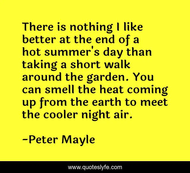 This page presents the quote "There is nothing I like better at the end of a hot summer's day than taking a short walk around the garden. You can smell the heat coming up from the earth to meet the cooler night air.". Author of this quote is Peter Mayle. This quote is about short, day, walk,.