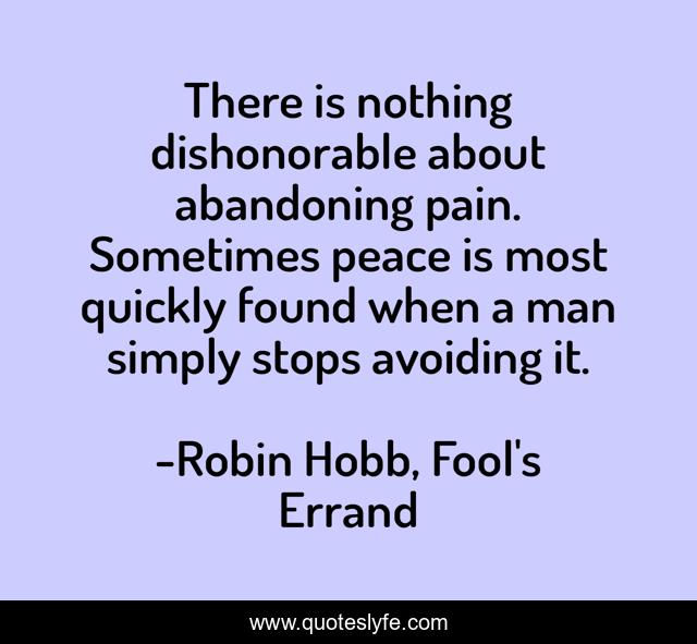 This page presents the quote "There is nothing dishonorable about abandoning pain. Sometimes peace is most quickly found when a man simply stops avoiding it.". Author of this quote is Robin Hobb, Fool's Errand. This quote is about move-on, forget, avoid, peace, dishonor, honor, truth, pain, find,.