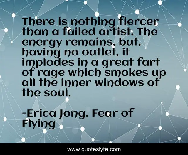 This page presents the quote "There is nothing fiercer than a failed artist. The energy remains, but, having no outlet, it implodes in a great fart of rage which smokes up all the inner windows of the soul.". Author of this quote is Erica Jong, Fear of Flying. .