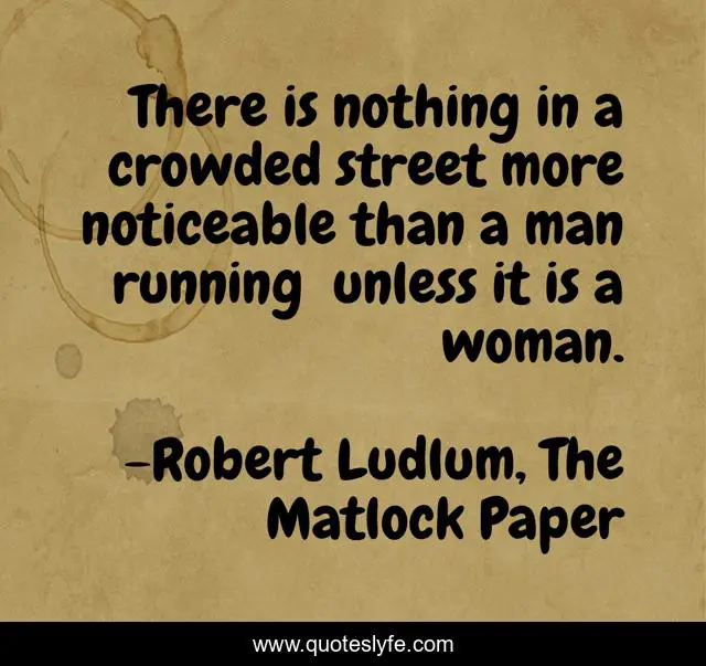 This page presents the quote "There is nothing in a crowded street more noticeable than a man running ― unless it is a woman.". Author of this quote is Robert Ludlum, The Matlock Paper. This quote is about notice, street, run, crowd, woman,.