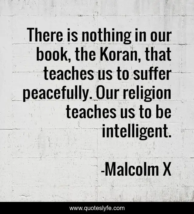 This page presents the quote "There is nothing in our book, the Koran, that teaches us to suffer peacefully. Our religion teaches us to be intelligent.". Author of this quote is Malcolm X. This quote is about nothing, book, intelligent,.