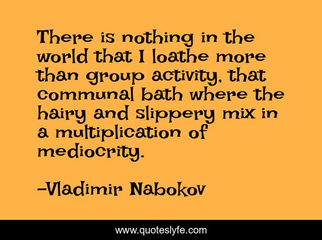 This page presents the quote "There is nothing in the world that I loathe more than group activity, that communal bath where the hairy and slippery mix in a multiplication of mediocrity.". Author of this quote is Vladimir Nabokov. This quote is about world, group, mediocrity,.