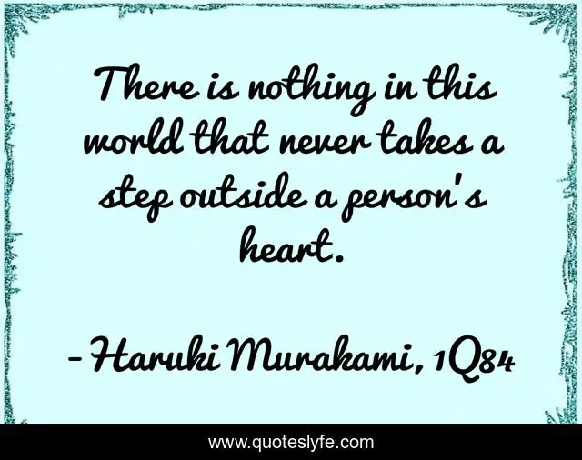 This page presents the quote "There is nothing in this world that never takes a step outside a person's heart.". Author of this quote is Haruki Murakami, 1Q84. This quote is about heart, love, honesty, secrets, intent, affection, internal-self,.