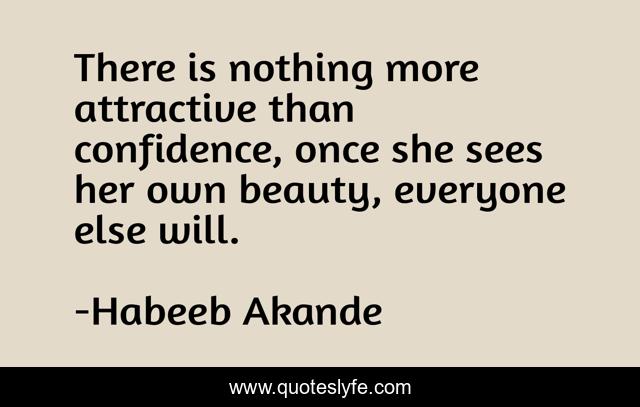 This page presents the quote "There is nothing more attractive than confidence, once she sees her own beauty, everyone else will.". Author of this quote is Habeeb Akande. This quote is about female-beauty, confidence, attractive, beauty,.