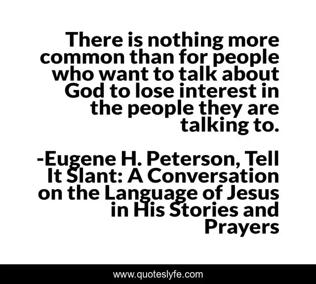This page presents the quote "There is nothing more common than for people who want to talk about God to lose interest in the people they are talking to.". Author of this quote is Eugene H. Peterson, Tell It Slant: A Conversation on the Language of Jesus in His Stories and Prayers. This quote is about discipleship, evangelism,.