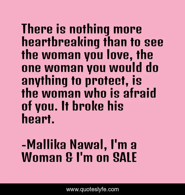 This page presents the quote "There is nothing more heartbreaking than to see the woman you love, the one woman you would do anything to protect, is the woman who is afraid of you. It broke his heart.". Author of this quote is Mallika Nawal, I'm a Woman & I'm on SALE. This quote is about love, protectiveness, heartbreaking, love-hurts, protector, affection,.