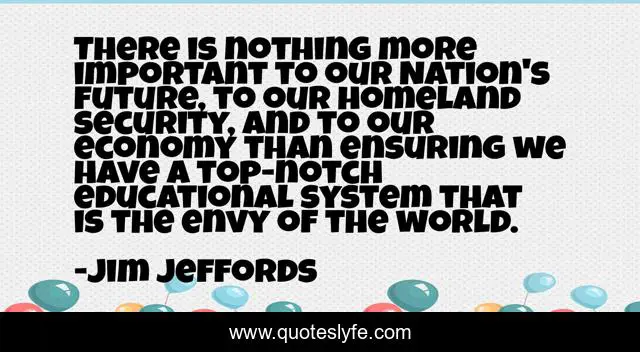 This page presents the quote "There is nothing more important to our Nation's future, to our homeland security, and to our economy than ensuring we have a top-notch educational system that is the envy of the world.". Author of this quote is Jim Jeffords. This quote is about world, security, economy,.