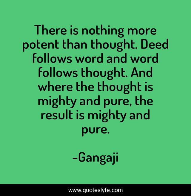 This page presents the quote "There is nothing more potent than thought. Deed follows word and word follows thought. And where the thought is mighty and pure, the result is mighty and pure.". Author of this quote is Gangaji. This quote is about thought, deeds, power,.