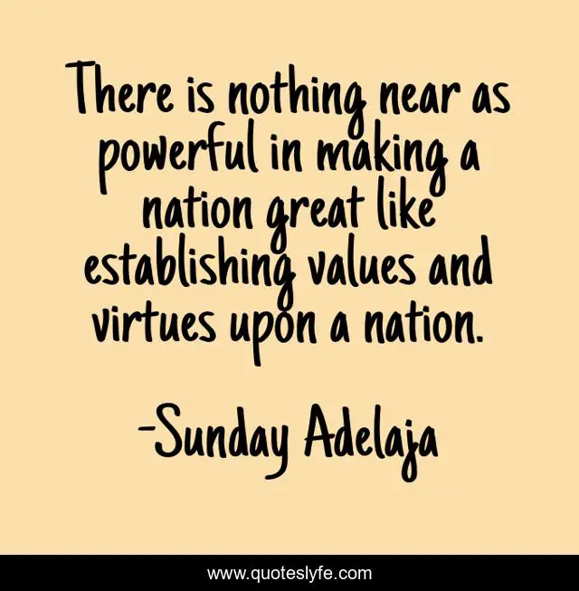 This page presents the quote "There is nothing near as powerful in making a nation great like establishing values and virtues upon a nation.". Author of this quote is Sunday Adelaja. This quote is about powerful, values, virtues, nation,.