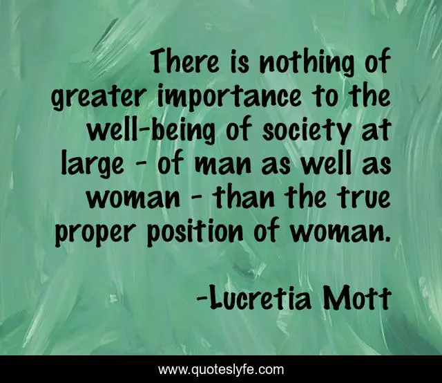 This page presents the quote "There is nothing of greater importance to the well-being of society at large - of man as well as woman - than the true proper position of woman.". Author of this quote is Lucretia Mott. This quote is about woman, well-being, man,.