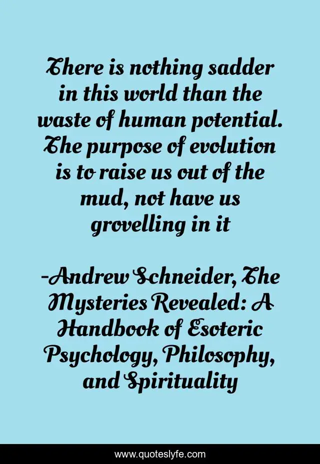 This page presents the quote "There is nothing sadder in this world than the waste of human potential. The purpose of evolution is to raise us out of the mud, not have us grovelling in it". Author of this quote is Andrew Schneider, The Mysteries Revealed: A Handbook of Esoteric Psychology, Philosophy, and Spirituality. This quote is about enthusiasm, potential, inspirational,.