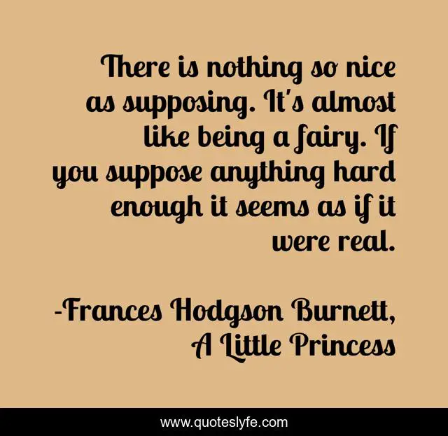 This page presents the quote "There is nothing so nice as supposing. It's almost like being a fairy. If you suppose anything hard enough it seems as if it were real.". Author of this quote is Frances Hodgson Burnett, A Little Princess. This quote is about magic, a-little-princess, fairy-tale, fantasy, fairy-tales, manifestation, princess,.